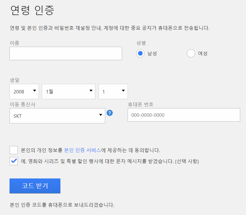 - 넷플릭스 연령인증은 본인의 이동통신사 휴대폰을 통해 진행됩니다.